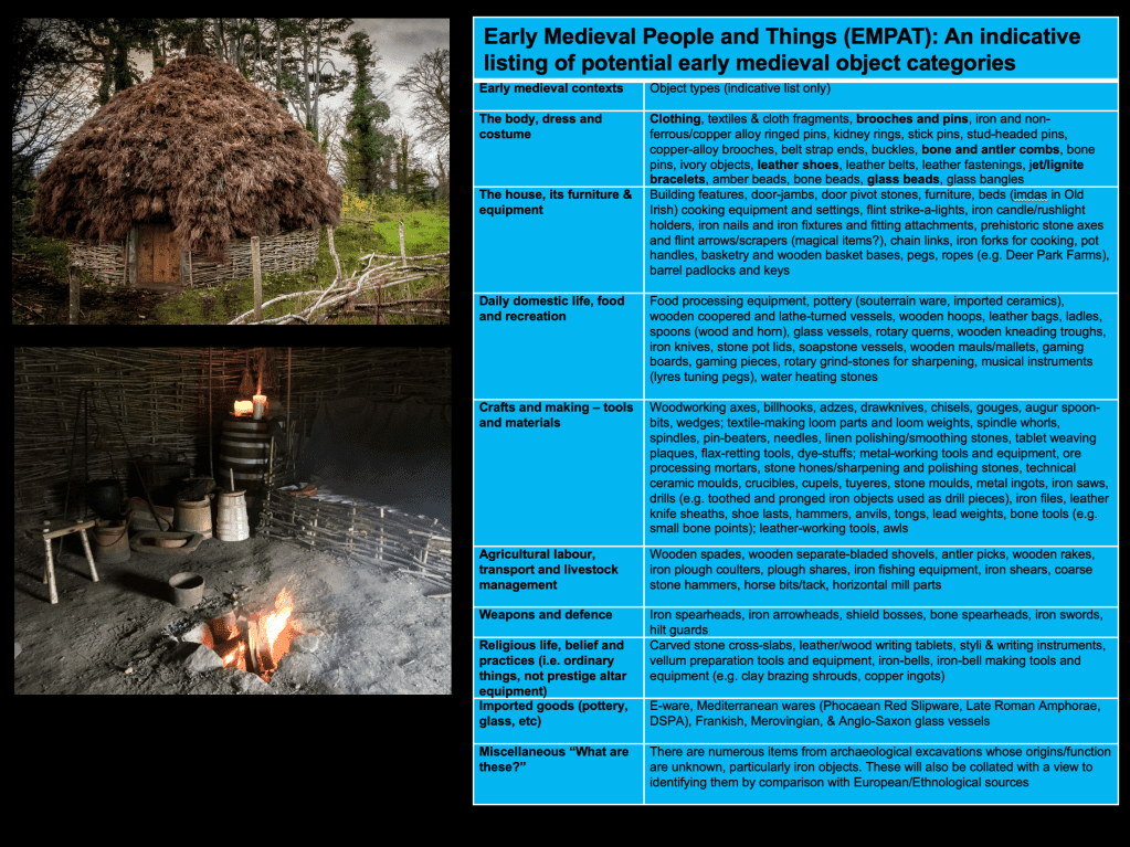 The Early Medieval People and Things (EMPAT) project seeks to create knowledge on how people in early medieval Ireland, AD 400-1100, made, used and discarded things, from the things of the body to the tools and equipment of the household, to the things used in the land beyond, and the role and character of material culture in early medieval Ireland in its northwest European contexts.