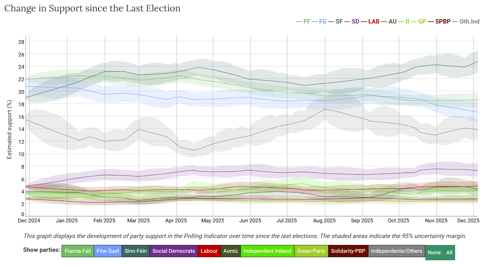 Drawing on over 750 polls from 1987 to 2025, the Indicator uses a Bayesian statistical model to estimate party support while clearly communicating uncertainty. This approach allows journalists, policymakers, and the public to focus on broader trends rather than individual polls. Updated after each new poll, the IPI has become a vital resource for understanding Irish politics. RTÉ, The Financial Times, Reuters, The Sunday Independent, The Times, and The Business Post have relied on the IPI to inform coverage. The Guardian and BreakingNews.ie have also developed interactive visualisations using IPI data, reflecting the project’s growing influence.