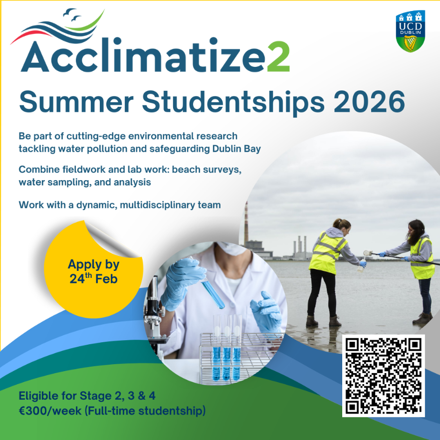 The Acclimatize 2 team is now inviting applications from undergraduate students for a limited number of summer studentships. We are looking for reliable, motivated and enthusiastic individuals to help conduct beach surveys and collect and analyse water samples from rivers and beaches in Dublin Bay. These studentships will provide students with an exciting opportunity to gain fieldwork and laboratory experience as part of a multidisciplinary research project.